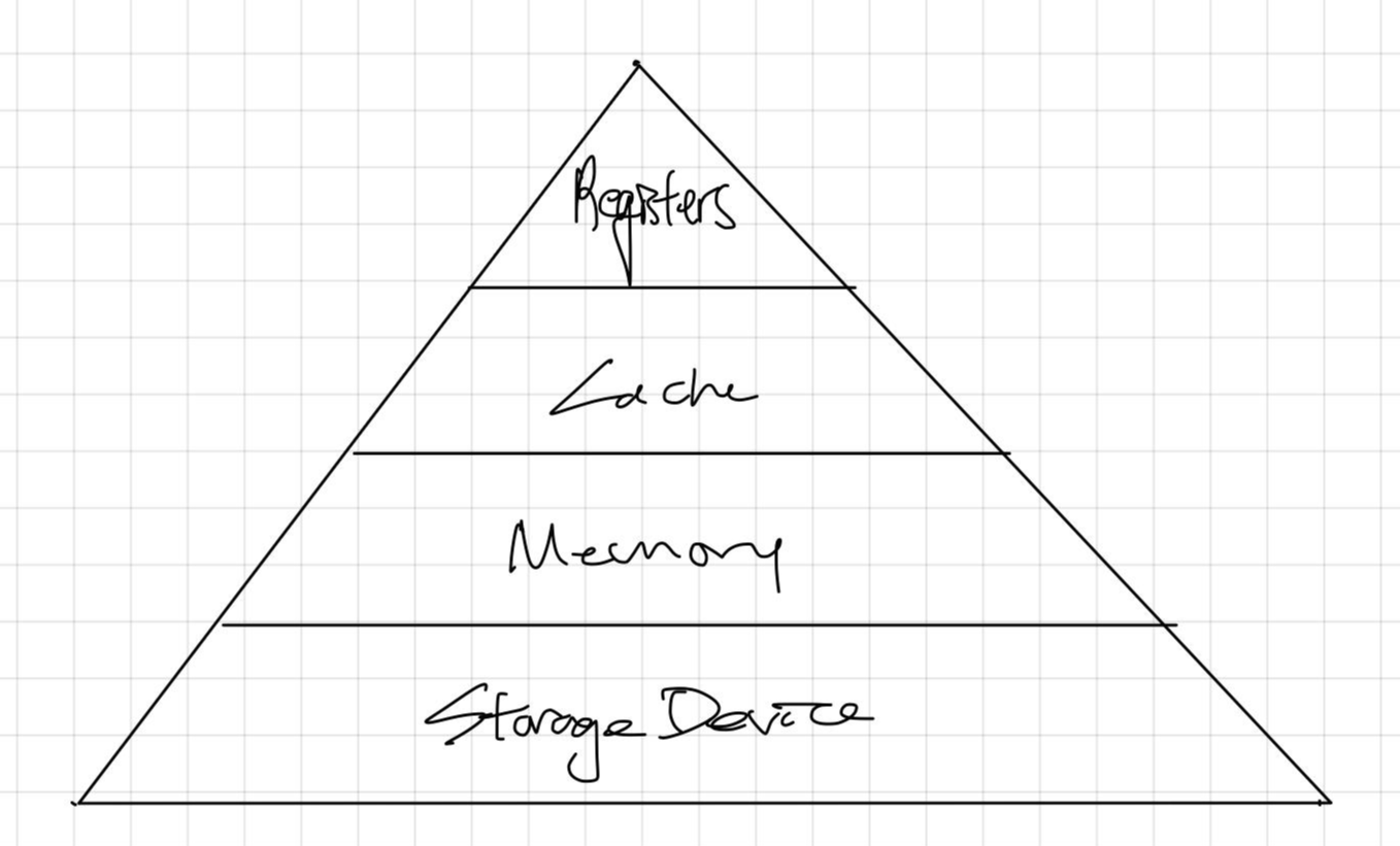 이 그림에서 위로 올라갈 수록 CPU와 거리가 가깝고, 따라서 빠르다. 하지만 그림에서 직관적으로 알 수 있듯이, 저장공간은 작다.