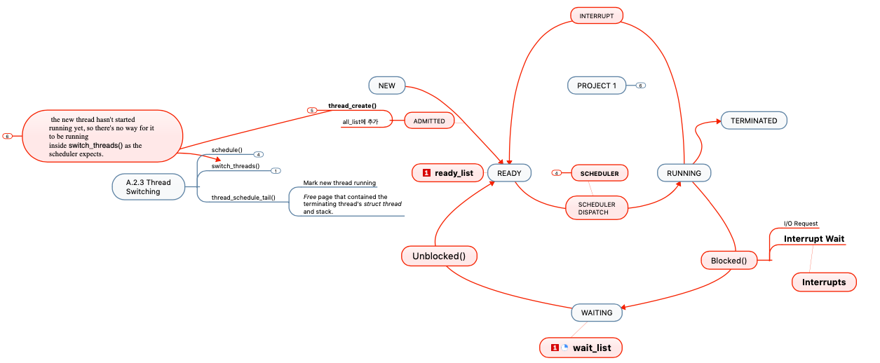 예시로 가져온, PINTOS 운영체제 안에서 프로세스의 생성부터 소멸까지를 나타낸 마인드맵이다.