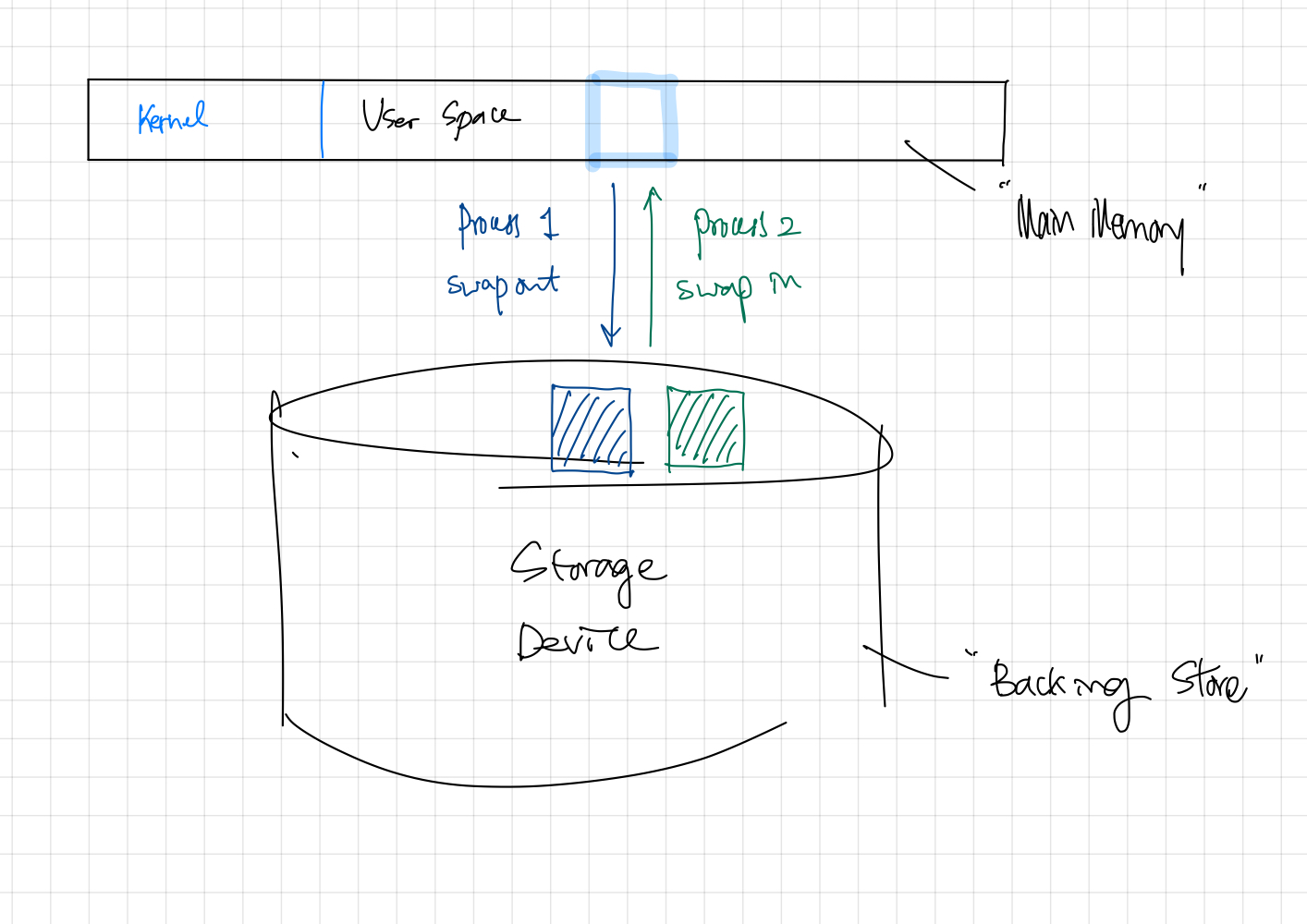 따라서 필요에 따라 운영체제는 프로세스를 Main Memory 와 Backing Store (Storage Disk라고 보면 된다) 두 위치에서 'Swapping'을 통해 이동시킨다. 그 목적은 Main Memory 공간을 더 효율적으로 사용하기 위해서라고 이해하면 될 것 같다.