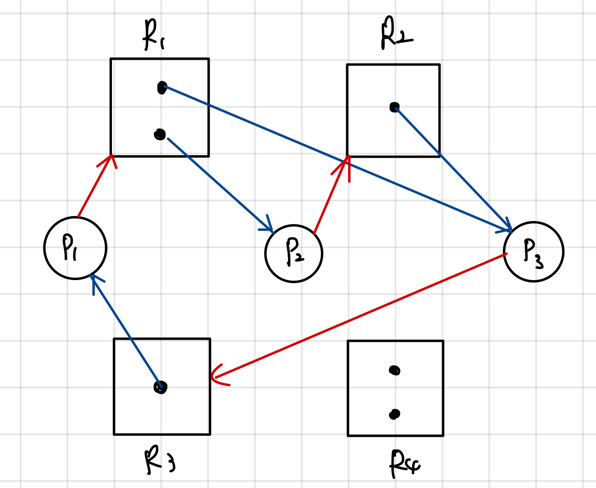 위 그림에서는 자원의 종류당 여러 개의 인스턴스가 있는 경우를 나타내기 위해 '점'을 여러개 찍어두었다.